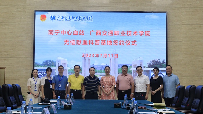 7月11日,在广西交通职业技术学院昆仑校区管理楼一楼会议室举行无偿献血科普基地签约仪式,仪式上,南宁中心血站与广西交通职业技术学院共同签订了《南宁中心血站·广西交通职业技术学院高校无偿献血科普基地合作共建协议书》,联动发挥站校科普教育资源优势,拟共同打造高校无偿献血公益意识的宣传教育品牌和“一站式”学生社区综合管理模式的特色名片。