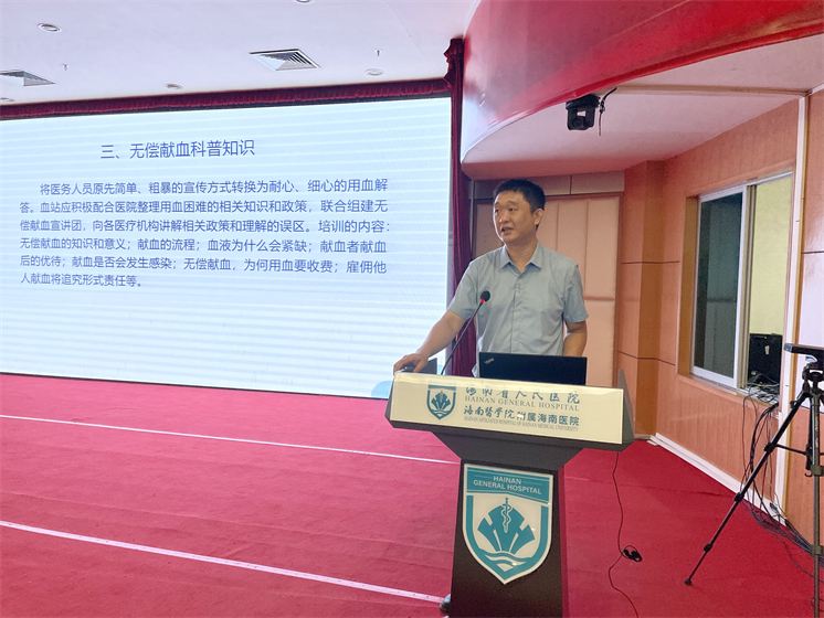 培训班首先邀请了海南省血液中心宣传招募科科室负责人郑日大为现场医务人员讲解无偿献血科普知识。郑日大从三个视角对我省无偿献血工作进行了深入浅出的讲解。一是无偿献血现状、二是医务人员宣传无偿献血的重要性、三是科普无偿献血知识。特别是在医务人员向患者亲友进行无偿献血宣传工作中,对存在的常见疑难问题进行了详尽的解答——无偿献血的知识和意义;献血的流程;造成血液紧缺的原因;献血者献血后的优待情况;献血不会发生感染的原因;无偿献血用血收费的原因;非法采供血者应承担的相应法律责任等等。
