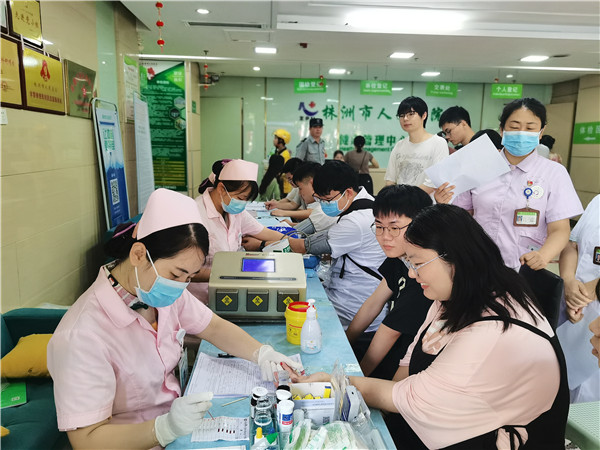 7月21日上午9点,株洲市人民医院无偿献血活动刚开始,就迅速排起了献血长队。