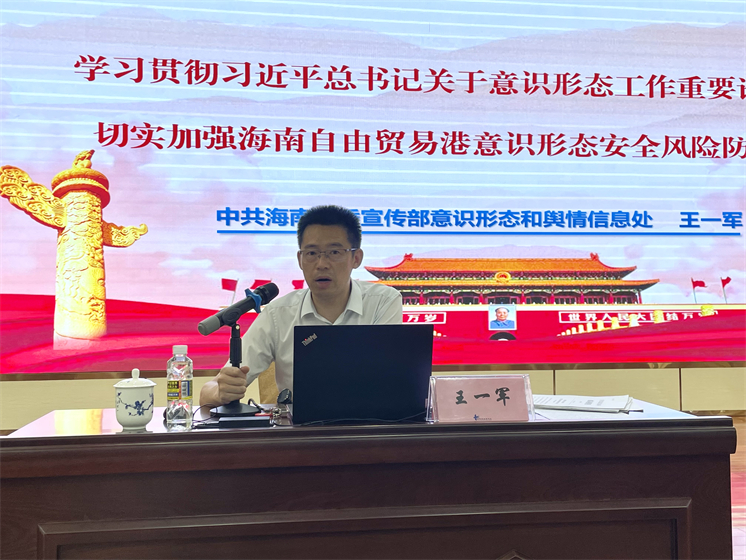 培训会上,王一军以《学习贯彻习近平总书记关于意识形态工作的重要论述精神,切实加强海南自由贸易港意识形态安全风险防控工作》为题,围绕“什么是意识形态”“意识形态工作做什么”“怎么理解意识形态工作的极端重要性”“当前我省意识形态领域的主要风险点有哪些”“怎么做好新时代的意识形态风险防控工作”等五个方面,结合实际案例、系统讲解了当前意识形态工作的新形势,全面阐述了意识形态工作落实的任务要求和具体举措,讲座既有理论高度,又有实践深度,为与会人员作了一场生动精彩的宣讲。