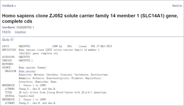 据资料显示,大洋洲的波利尼西亚人种中Jk(a-b-)表型较普遍,频率与我国“熊猫血”接近,但在其他国家甚是少见。我站共筛查样本9.55万人次,仅发现3例Jk(a-b-)表型,发生频率约为十万分之三,也就是说3万人中才有一个此类血型,表明该血型更加稀有。此外,Jk(a-b-)先证者可能会产生抗-Jk3高频抗体,能引起严重的立即型和迟发型溶血性输血反应。如果临床患者需要这一稀有血型而找不到相匹配的血液,可能会发生非常严重的并发症并导致死亡。因此,稀有血型的发现在临床输血中具有重要意义。