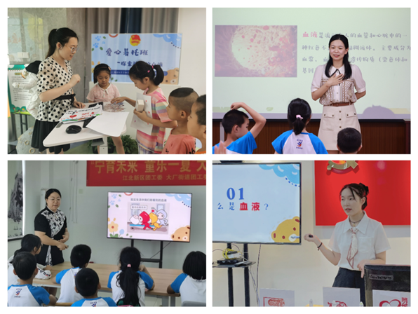为学习宣传贯彻党的二十大精神,助力青少年德育教育发展、丰富青少年健康教育知识,加强无偿献血科普宣传,给假期中的孩子们带来多彩、有趣、有益的公益课程,让青春在公益舞台上绽放光芒,2023年7~8月,南京红十字血液中心“血脉相连”青年志愿宣讲团走进江北新区和玄武区,开展“爱心暑托班”公益宣讲志愿服务活动。