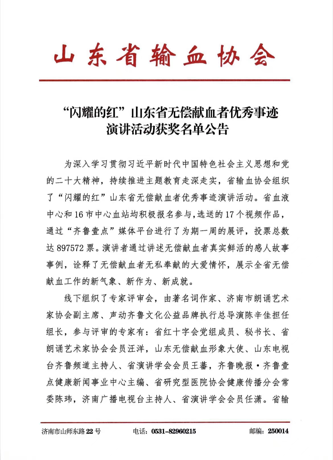 【喜报】我市在“闪耀的红”山东省无偿献血者优秀事迹演讲活动中荣获一等奖