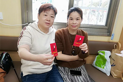 5月8日吉桂芳和蔡雨芬再次相约一起献血,下午四点半,她们来到妇幼献血屋,经过征询,体检,化验后,两人都符合献血体检要求,她们分别献出了300毫升的血液,两袋热血铸就的爱心汇入了名为无偿献血的爱之长河中。两位女士成功献血后让工作人员帮她们拍摄了手持献血证的照片。蔡雨芬说她要把照片发到微信群中,像她这样瘦弱的人都能坚持献血,证明献血对人体是没有伤害的。她们想让自己的亲人和朋友都能加入无偿献血者行列,并且还准备建一个无偿献血群,这样大家可以互相鼓励互相督促。假如血站缺血时,只要一个人知道便可以通知大家。其实今天她们本来约好了3个人一起前来,还有一个姐妹临时有急事没能过来。说好了明天再陪她来,因为那位女士是第一次献血,需要她们两个资深献血者的鼓励。