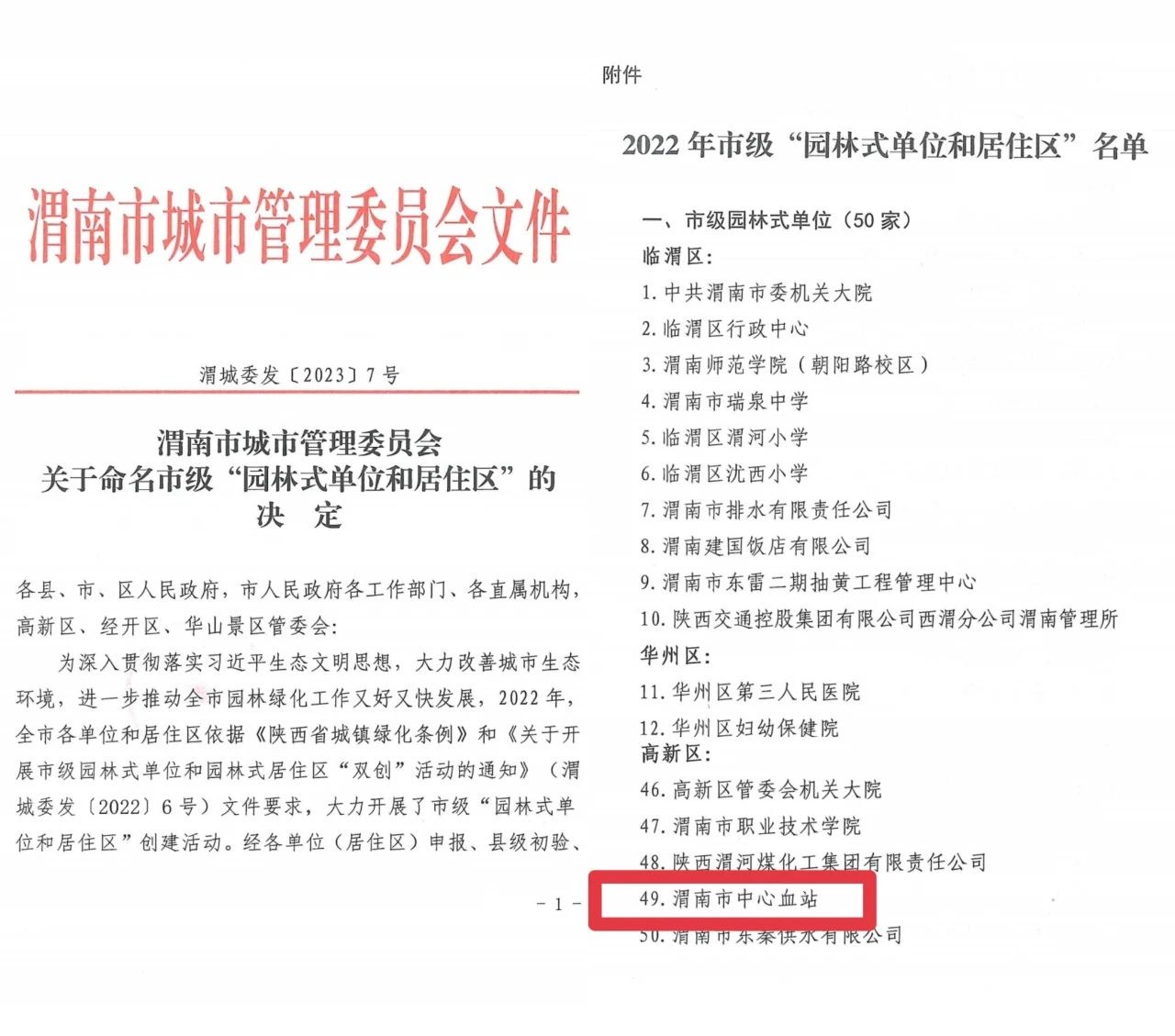 近日,渭南市城市管理委员会发布关于命名市级“园林式单位和居住区”的决定,渭南市中心血站被命名为市级“园林式单位”。