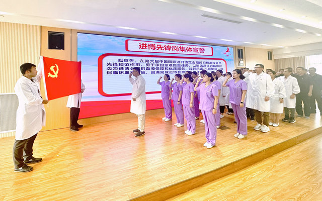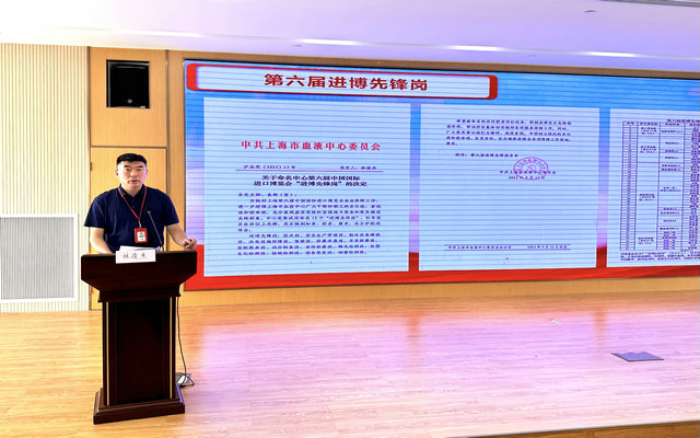主题党日活动开始,与会人员共同观看了第六届进博会主题形象片。随后,中心党委副书记、纪委书记、中心副主任林俊杰代表中心党委宣读了第六届进博先锋岗命名决定。林俊杰表示,自2018年首届进博会以来,中心已连续五年顺利完成进博期间的血液保障任务。每一届“进博先锋岗”的命名,都激励着中心党员率先垂范、全力以赴,让党旗在中心进博保障一线高高飘扬。希望被命名的15个“进博先锋岗”(47名党员)进一步增强责任感、紧迫感和使命感,充分发挥党组织的战斗堡垒作用和共产党员的先锋模范作用,积极带动所在集体以饱满昂扬的精神状态立足岗位、尽责担当,为第六届进博会圆满成功举行提供坚强保证。