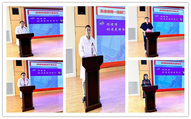 进博保障一线支部代表,第四党支部书记、制备供应部部长章怿及范亮峰(第二党支部)、胡晓旻(第三党支部)、周永嘉(第四党支部)、马丽敏(第五党支部)4名进博先锋岗党员代表分别围绕“进博保障,党员见行动”作表态发言,章怿带领34名“进博先锋岗”党员上台宣誓,带头作出“保障进博、先锋有我”的坚定承诺。