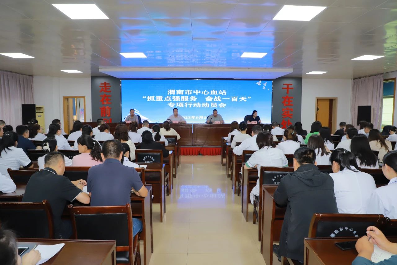 9月20日上午,渭南市中心血站召开“抓重点强服务 奋战一百天”专项行动动员会,会议由副站长吴剑主持,党总支书记、站长严胜利做动员讲话,血站领导班子成员、全体干部职工参加会议。