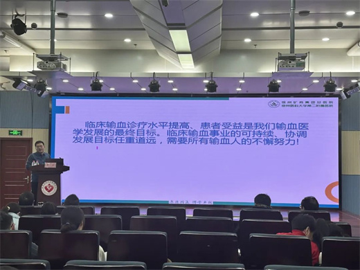 培训环节中,徐州市中心医院输血科董立杰主任从概念、适应症、原则及并发症等方面讲授大量输血相关知识,使参培人员受益匪浅;徐州矿务集团总医院输血科韩卫主任以《临床输血学学科建设思考》为题授课,指出了临床输血学科发展面临的机遇和挑战,也为输血从业人员指明了努力的方向。
