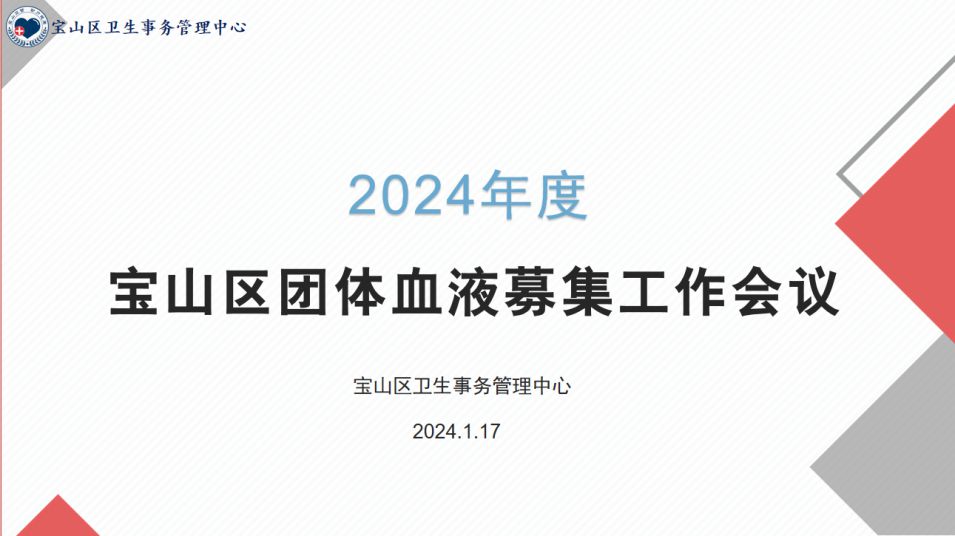 2024年1月17日,宝山区卫生事务管理中心召开“2024年度宝山区团体血液募集工作会议”。卫管中心副主任李亚梅出席,区各街镇、工业园区献血负责人参加会议。会议邀请上海市血液管理办公室血源统筹部王玮部长开展专题培训。