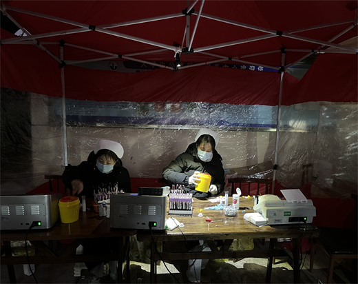 懂得奉献,甘于奉献。当凛冽的寒风刮过脸庞,十几个"燕尾帽"紧了紧工作服的领口,对着冻僵的手指呵出白雾,不停搬运着集体采血的物资。工作往往持续到“夜间模式”,在临时搭建的简易棚下,她们反复核对采血标本,四周已是一片漆黑。用餐经常是便宜行事,有时只是几分钟的简单充饥,只是为了让奉献少一分等待。