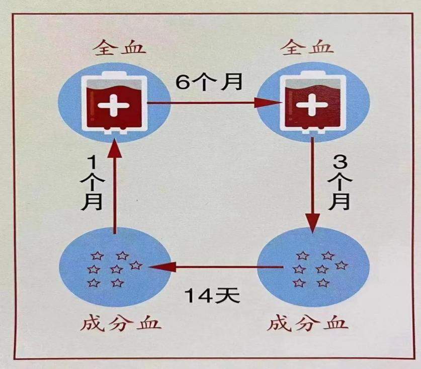 答:举个例子——小泉献了全血400毫升,那她要过六个月才可以再献全血,或者过三个月改献成分血;小宝献了2个单位血小板,那他两周后又可以再献血小板了,或者等四周后去献全血。现在明白了吧?
