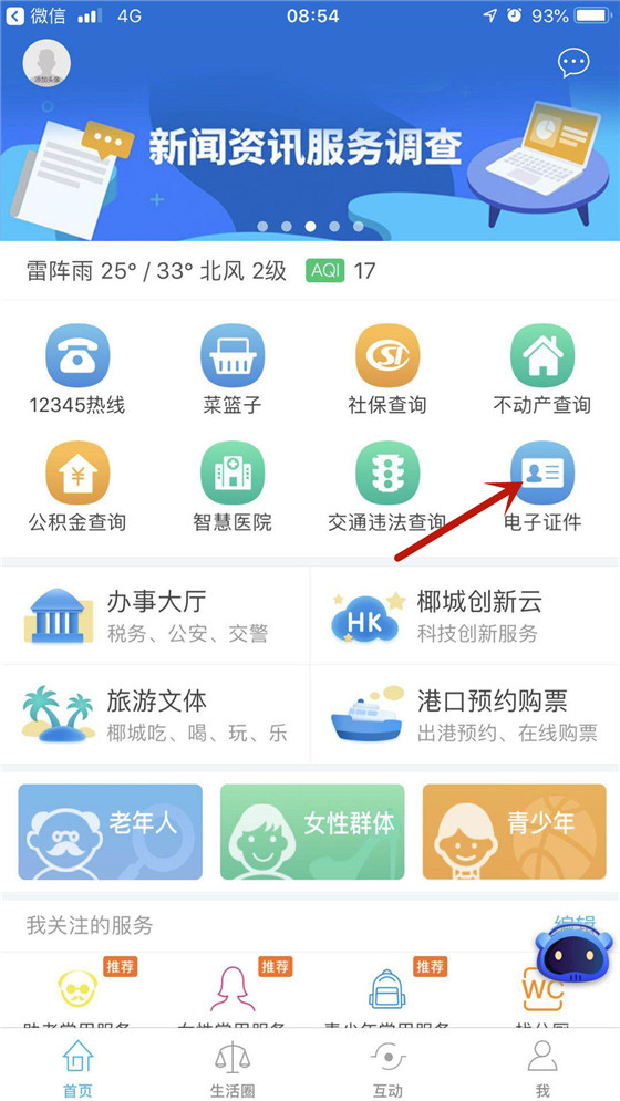 step2:实名登录后点击首页“电子证件”聚合页。
