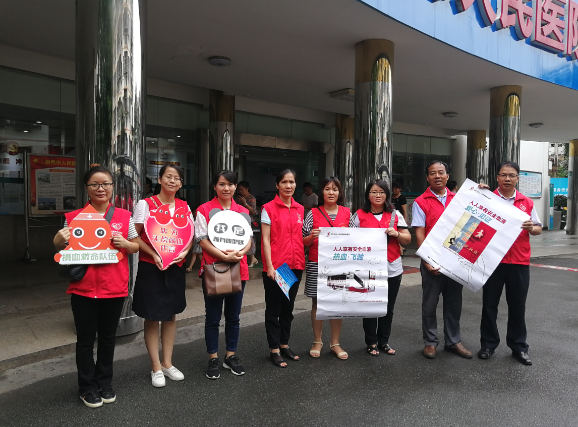 中心血站党员无偿献血志愿服务队在市医院门诊大楼前开展宣传活动