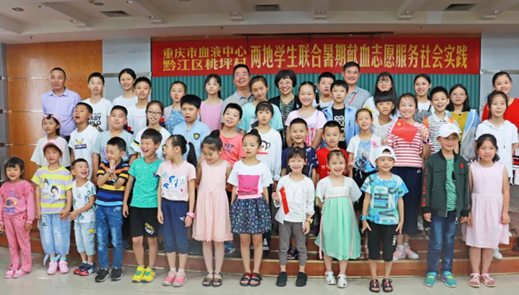 2019年7月12日,黔江区金溪镇桃坪村12名小学生们走进血液中心,开展了一场“暑期献血志愿服务”公益社会实践活动。重庆市血液中心党委书记段恒英,纪委书记钟吉元,驻桃坪村第一书记陈刚,桃坪村党支部书记龚斌参加了活动。
