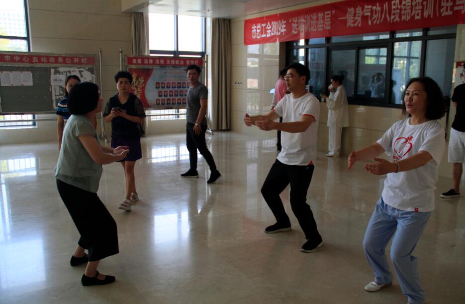 为响应创建“全国健康城市”和“健康单位”的号召,进一步坚定开展健康城市创建工作,同时,丰富职工群众精神文化生活。7月22日,驻马店市总工会“送培训 走基层”活动走进驻马店市中心血站,全站工会会员踊跃参与健身气功八段锦项目培训活动。