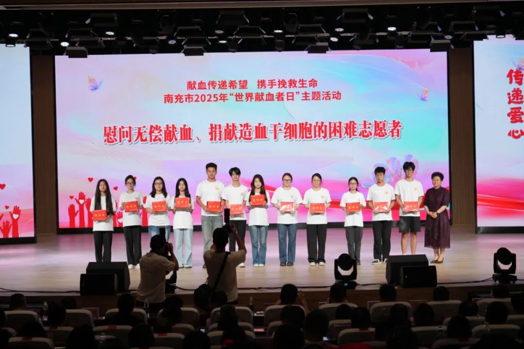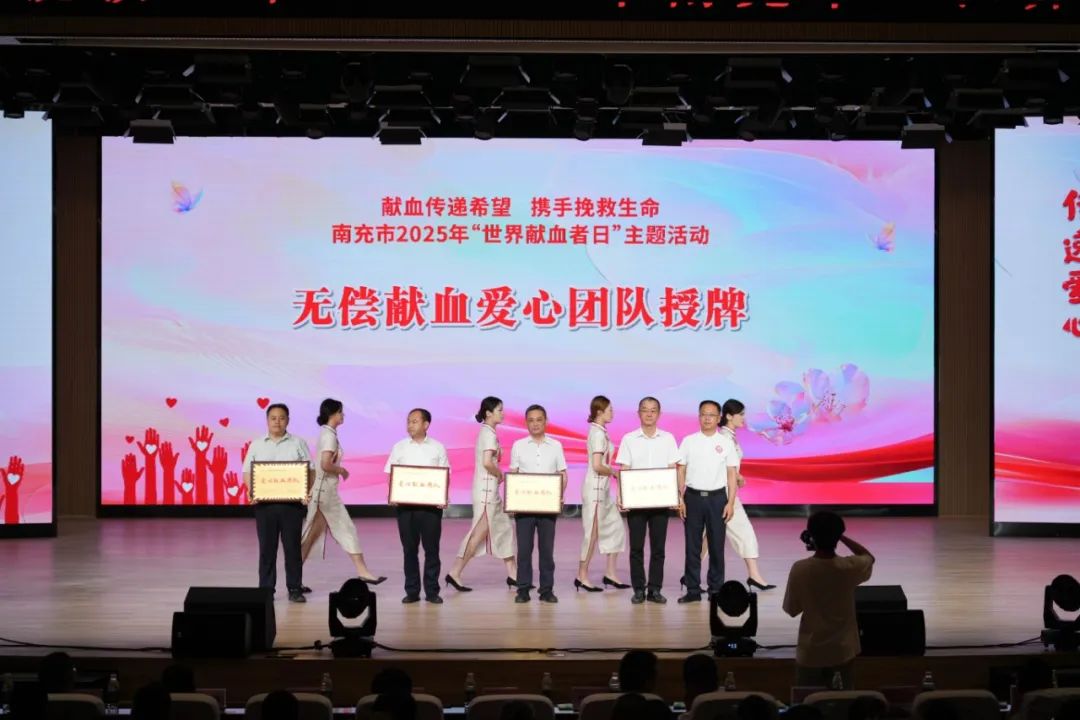 市卫健委主任任洁平向南充电影工业职业学院等四所高校颁发“无偿献血爱心团队”奖牌;