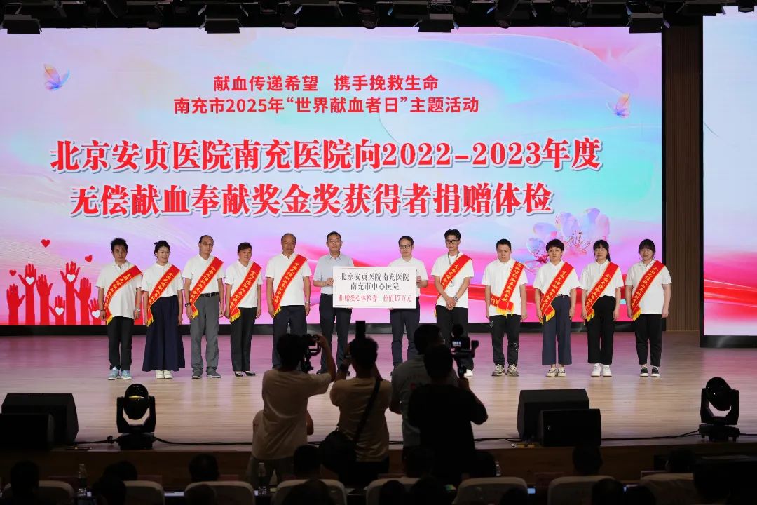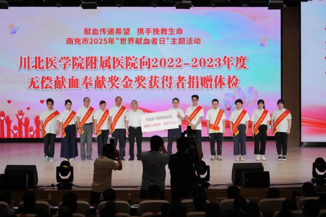 北京安贞医院南充医院党委书记朱胜国、川北医学院附属医院副院长唐晓平为2022-2023年度无偿献血奉献奖终身荣誉奖、金奖获得者捐赠健康体检券,市中心血站站长黄建荣及十名金奖获得者代表上台接受捐赠。
