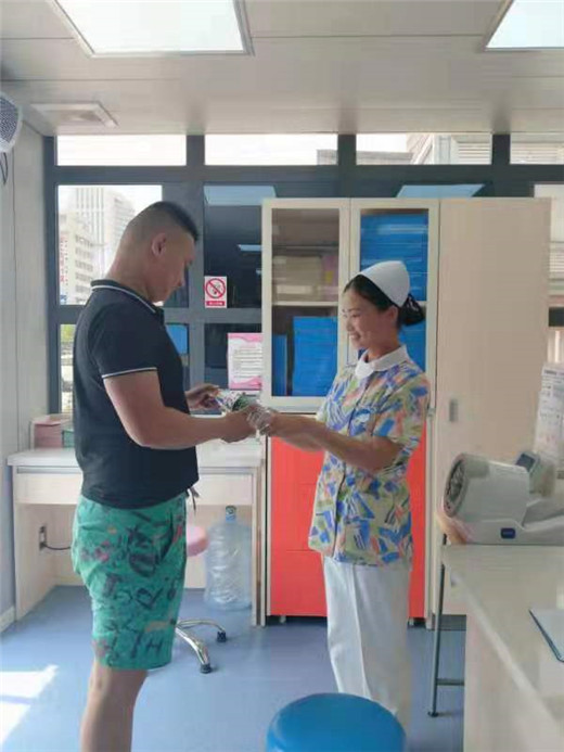 “送清凉”活动开展以来,市区各采血点发出温馨提示,接纳高温下过往市民、交警,特别是环卫工人和户外工作者就近到采血点饮水休息,此举广受好评。献血车里,一位满头大汗的环卫大妈接过护士递来的矿泉水,冰爽惬意地喝过几口后,感动地说:“虽然工作很辛苦,但还是有这么多人关心支持,这份情谊我们都会记在心里,天气再炎热,我们环卫工人都不会有一人拉下,尽心尽责把我们的城市清扫得更加干净!”