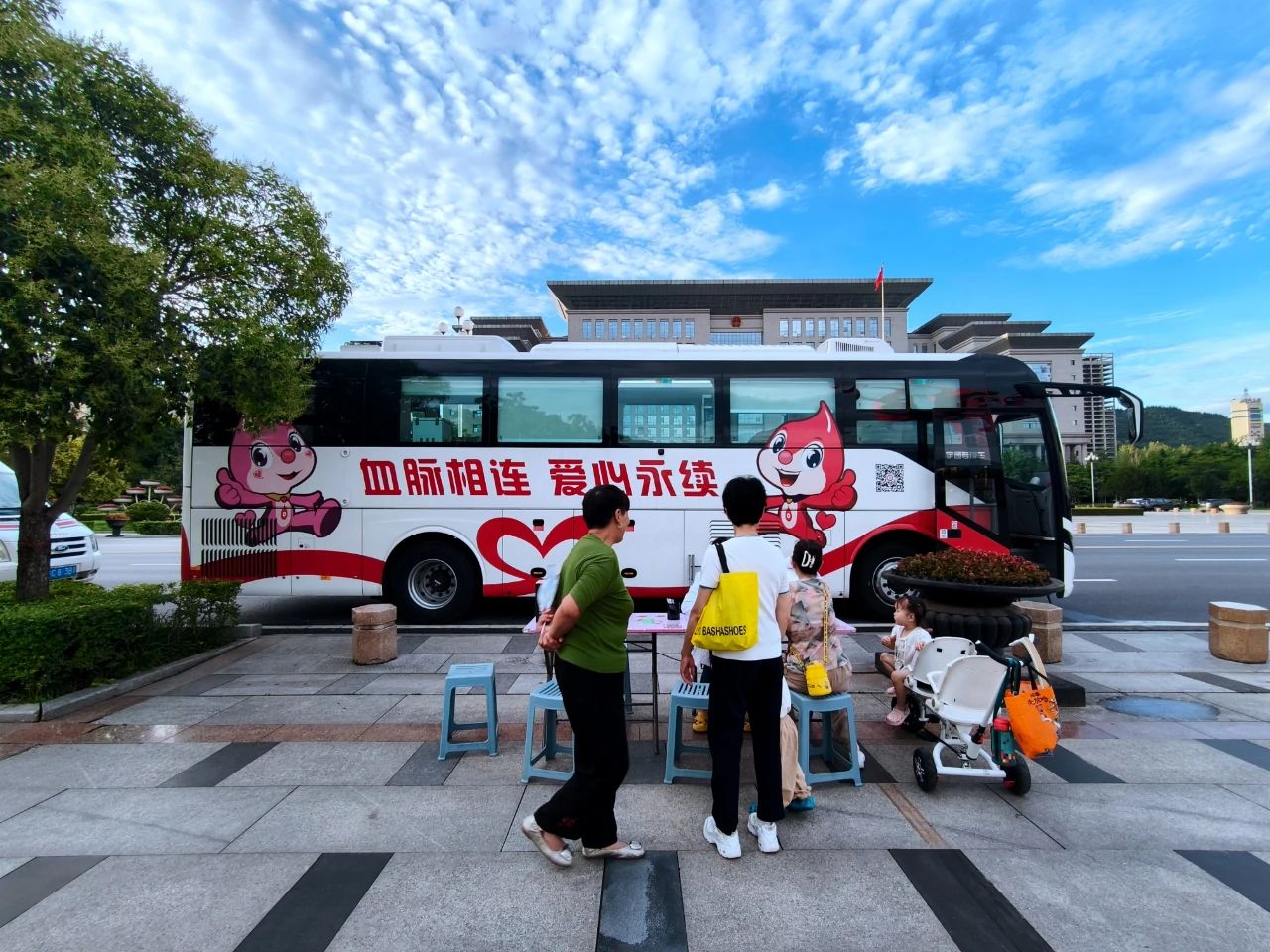 黄昏中的行政中心广场一隅,那辆橙红色的爱心献血车亮着温润的灯光,宛如夜色中漂浮的温暖岛屿。车身上的标语“血脉相连,爱心永续”悄然触动着路过的行人。