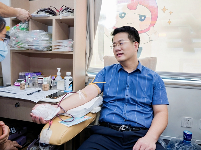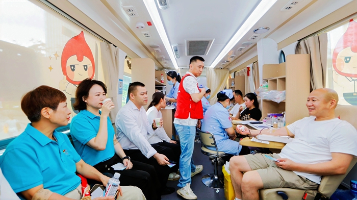 活动期间一道身影格外引人注目,他就是南宁龙胜商会会长谭周健。作为邕城无偿献血代言人之一,谭周健自2006年首次参与无偿献血以来,献血量超1万毫升。在自身示范引领的同时,谭周健积极组织发动商会会员开展团体献血活动,并利用工作生活之余向身边人传达无偿献血理念,用自己的故事引领更多的爱心人士关注和参与到无偿献血事业中来。活动当天,谭周健组织商会会员近30人参加献血活动,在现场他依然不忘“为无偿献血代言”,主动与参加活动的商会会员、企业员工交流,分享自己的献血经历与感悟,讲解献血优待政策,为拯救生命奉献力量。献血月首场活动结束后,谭周健还将继续组织商会会员单位开展献血活动,带动更多的人加入无偿献血行列中。