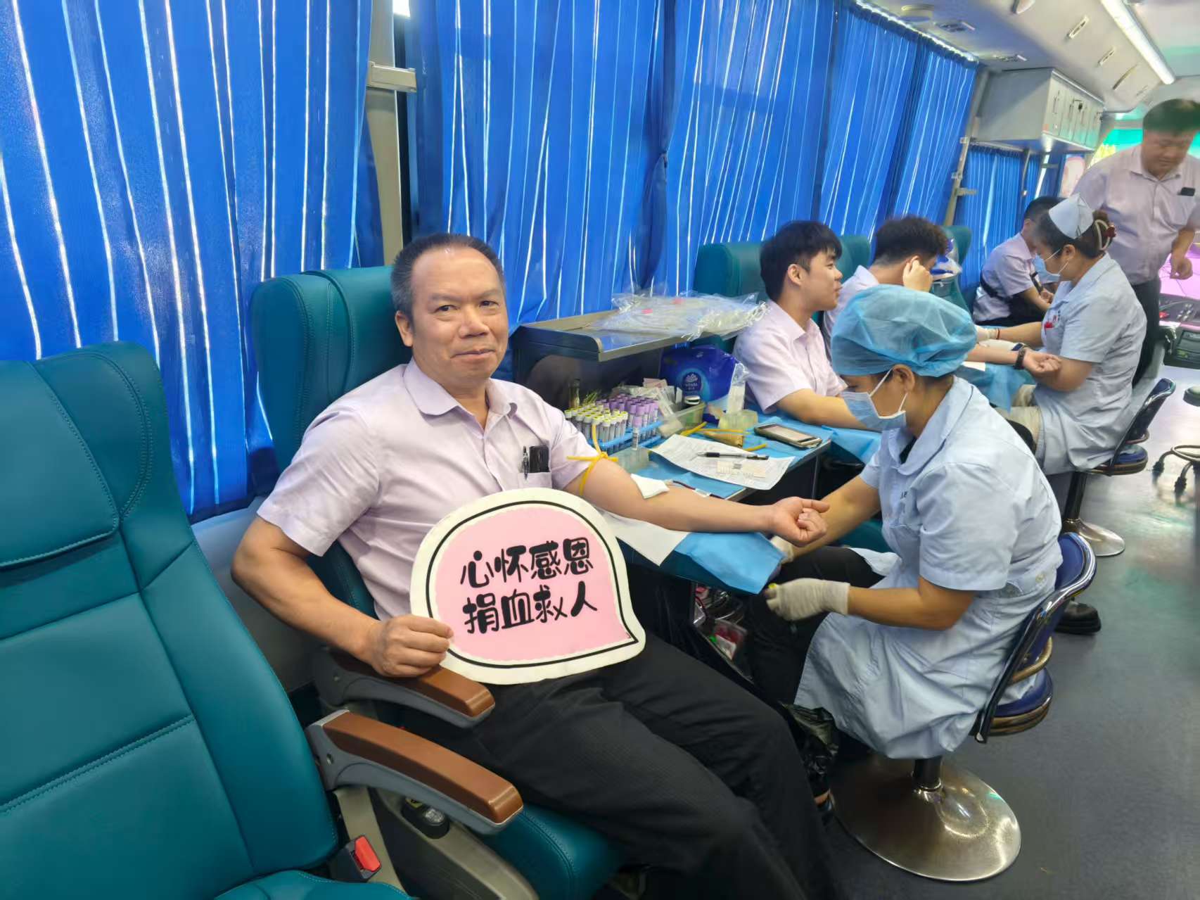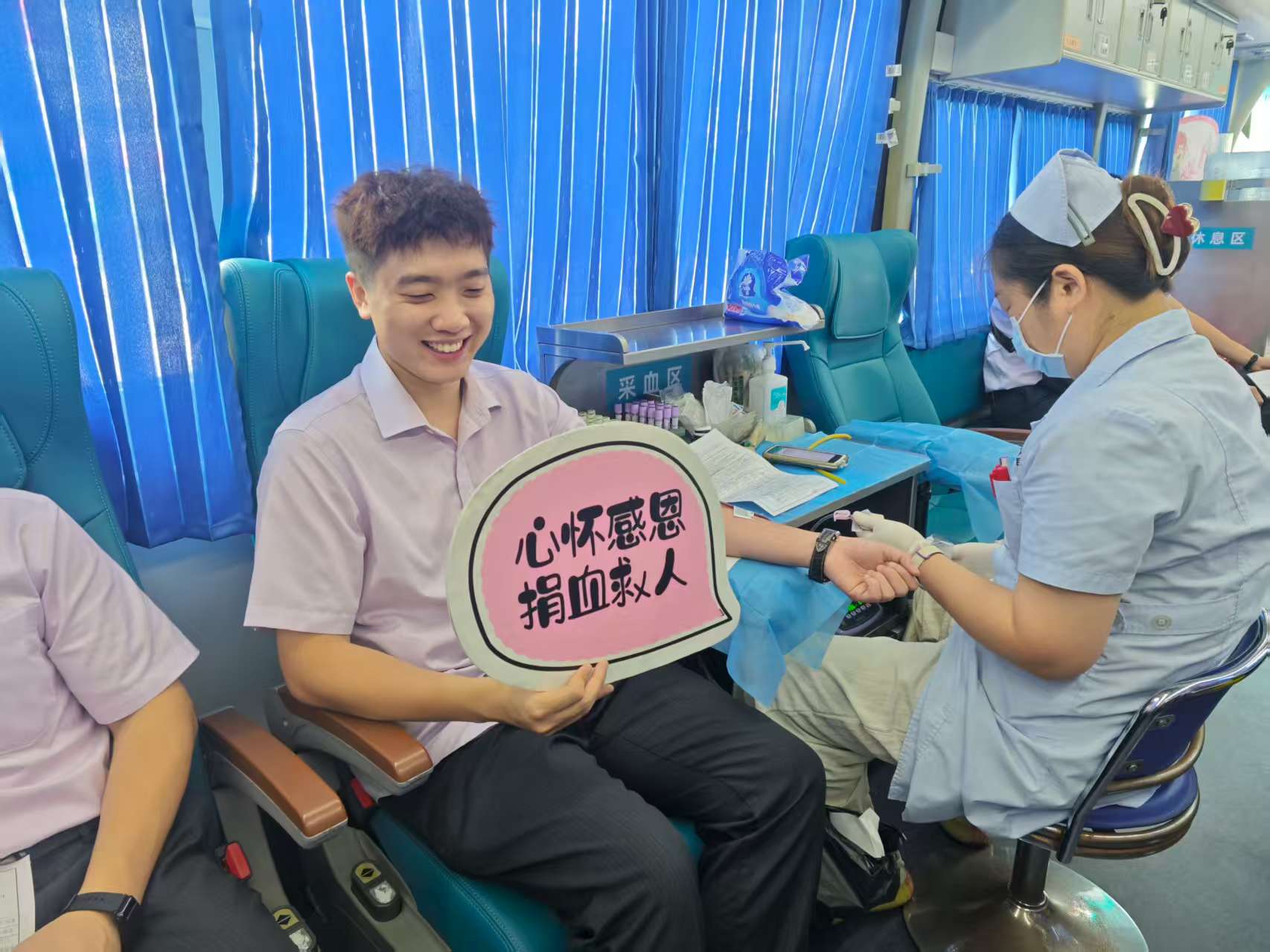 献血队伍中,有刚结束晨会就赶来的网点柜员,有特意调休从郊区赶来的客户经理,活动负责人汤泯锋第一个顶着耀眼的阳光走上采血车捋起袖子,他一边配合护士做检查,一边笑着说:“上周单位发出献血号召,心里一直惦记着呢。””客户经理廖勇智额头上渗着汗珠,衬衫后背早已被汗水浸湿,却笑着说:“这点热算啥?能帮上有需要的病患者才重要。”