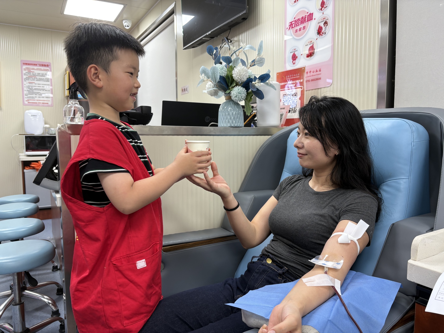 志愿者队伍中,舒承宇同学正忙碌地为献血者递上温水。在舒承宇的鼓励下他的母亲当晚也加入献血者行列,顺利的完成了人生第一次献血。看着母亲从容献血的背影,小宇的服务热情更加饱满。这是母亲用热血守护生命,孩子用服务传递关怀,母子二人以不同方式并肩守护着同一份爱心。