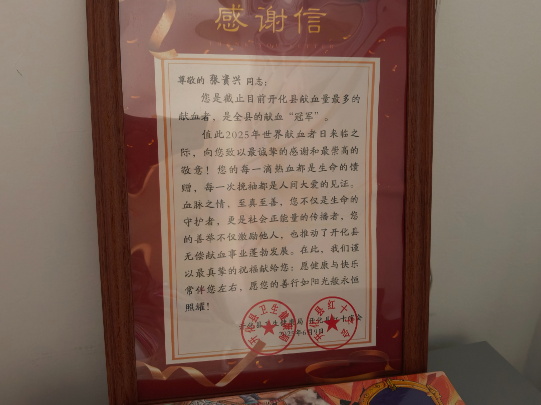 在当天的慰问中,县血站工作人员与张贵兴共同回顾了二十年的无偿献血奉献历程,从捐献全血到捐献“成分血”,从自己参加无偿献血到发动身边的人加入无偿献血队伍,从全国无偿献血奉献奖终身荣誉到全国最美家庭……这一份份沉甸甸的荣誉,不仅是对张贵兴52000毫升献血量的肯定,更是对他多年来为无偿献血事业奔走呼吁、无私奉献的最高礼赞。张贵兴告诉记者,无偿献血是一项光荣而高尚的社会公益事业,他希望更多年轻人加入无偿献血队伍,让‘爱的奉献’一直接力下去。