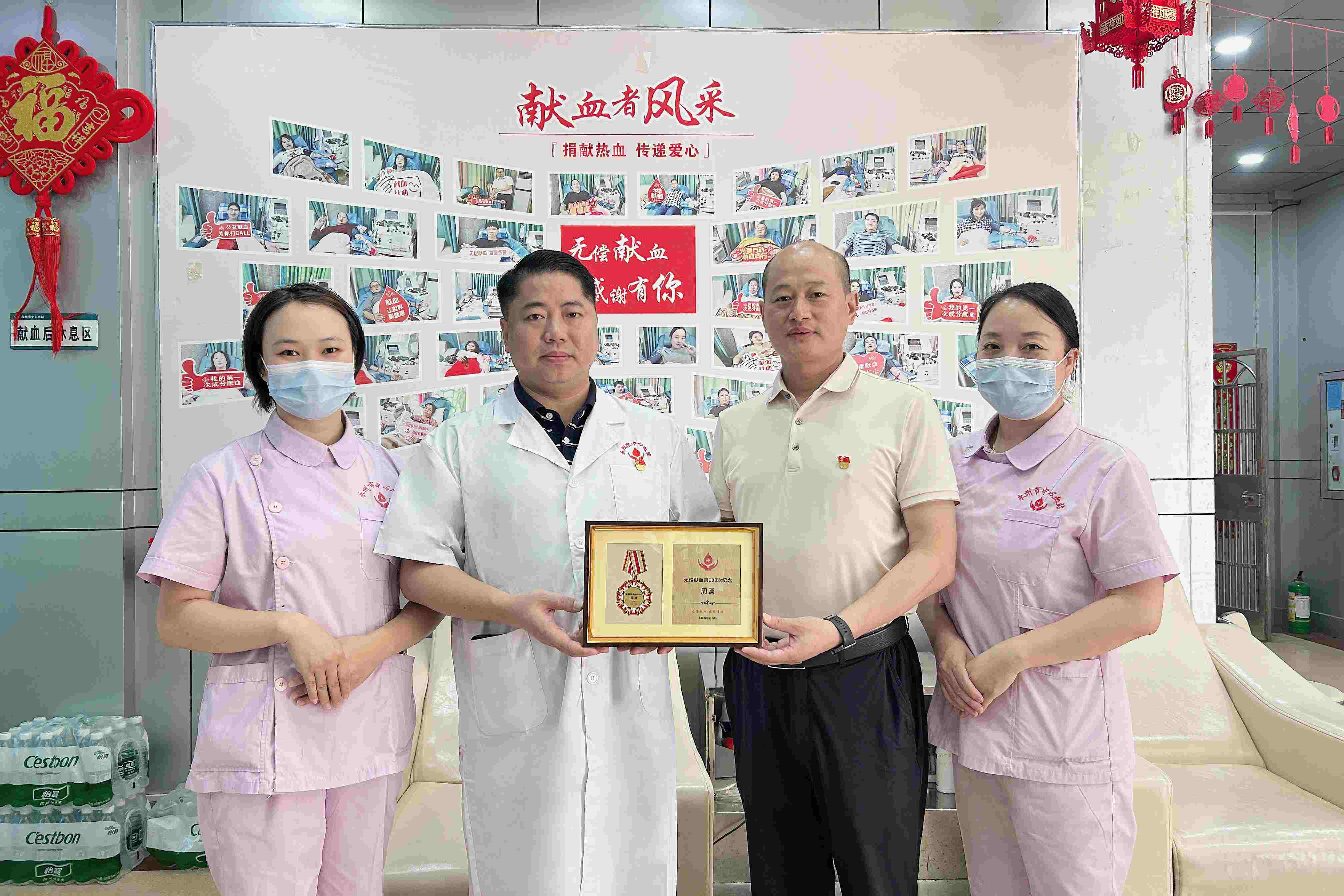 近日,永州市中心血站迎来了一位特殊的献血者——市公安局冷水滩分局民警周勇。这一天,他完成了第100次单采血小板捐献,用滚烫的热血与执着的坚守,为生命续航,向社会传递着无私奉献的正能量。