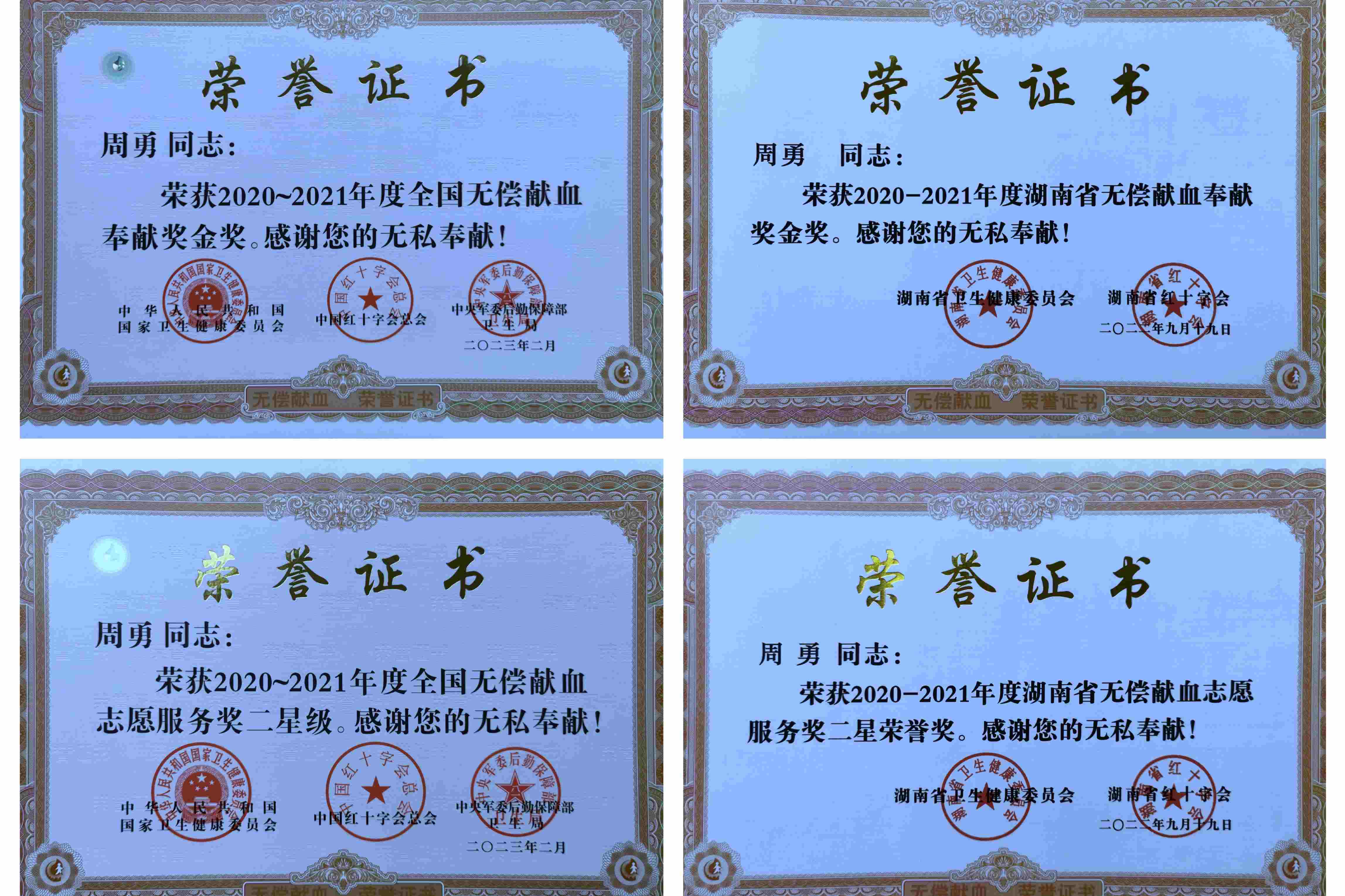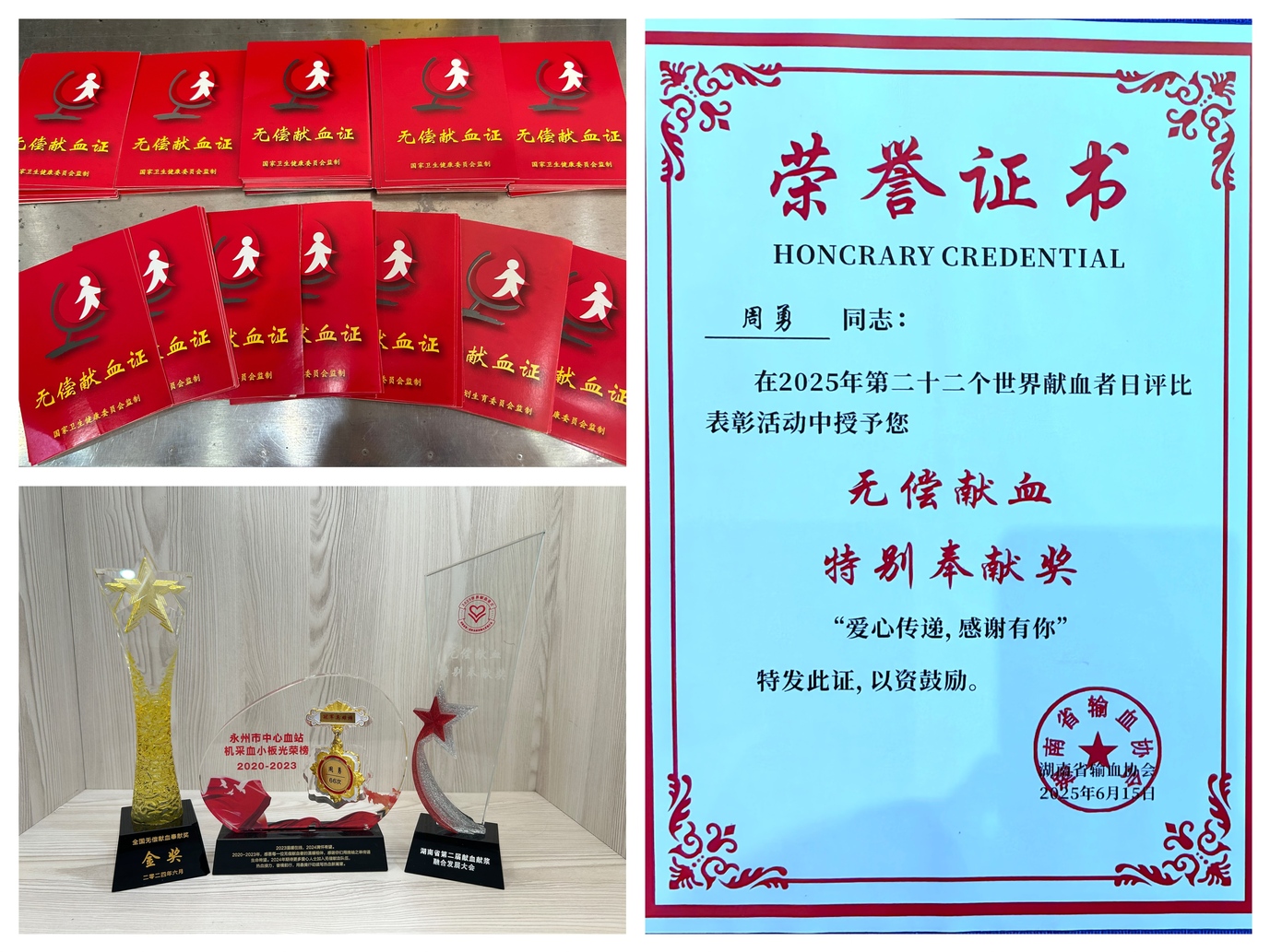 据统计,周勇在永州累计献血110次,其中全血10次共3900毫升,单采血小板100次合计40000毫升,总献血量达43900毫升。这组数字背后,是他将“让献血成为习惯”落到实处的生动写照,工作再忙,也会提前规划时间;身体稍有不适,便会主动调整状态,确保每次捐献都符合标准。这份执着让他先后斩获全国无偿献血奉献奖金奖、全国无偿献血志愿服务奖二星级等多项荣誉,更成为同事眼中“用行动诠释担当”的榜样。
