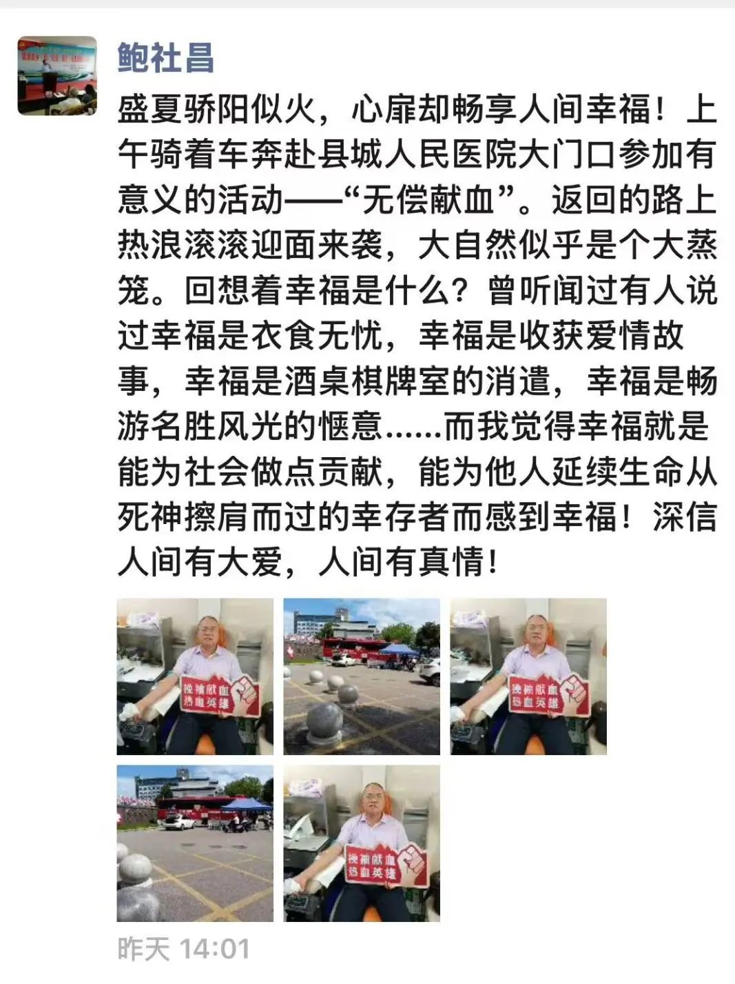 刚刚完成一次无偿献血、顶着七月酷热骑车回家的鲍社昌,在朋友圈里动情地写下了这段话。这份在热浪中升华的幸福感悟,正是这位62岁退休教师八年如一日坚守“生命之路”的动人心声。