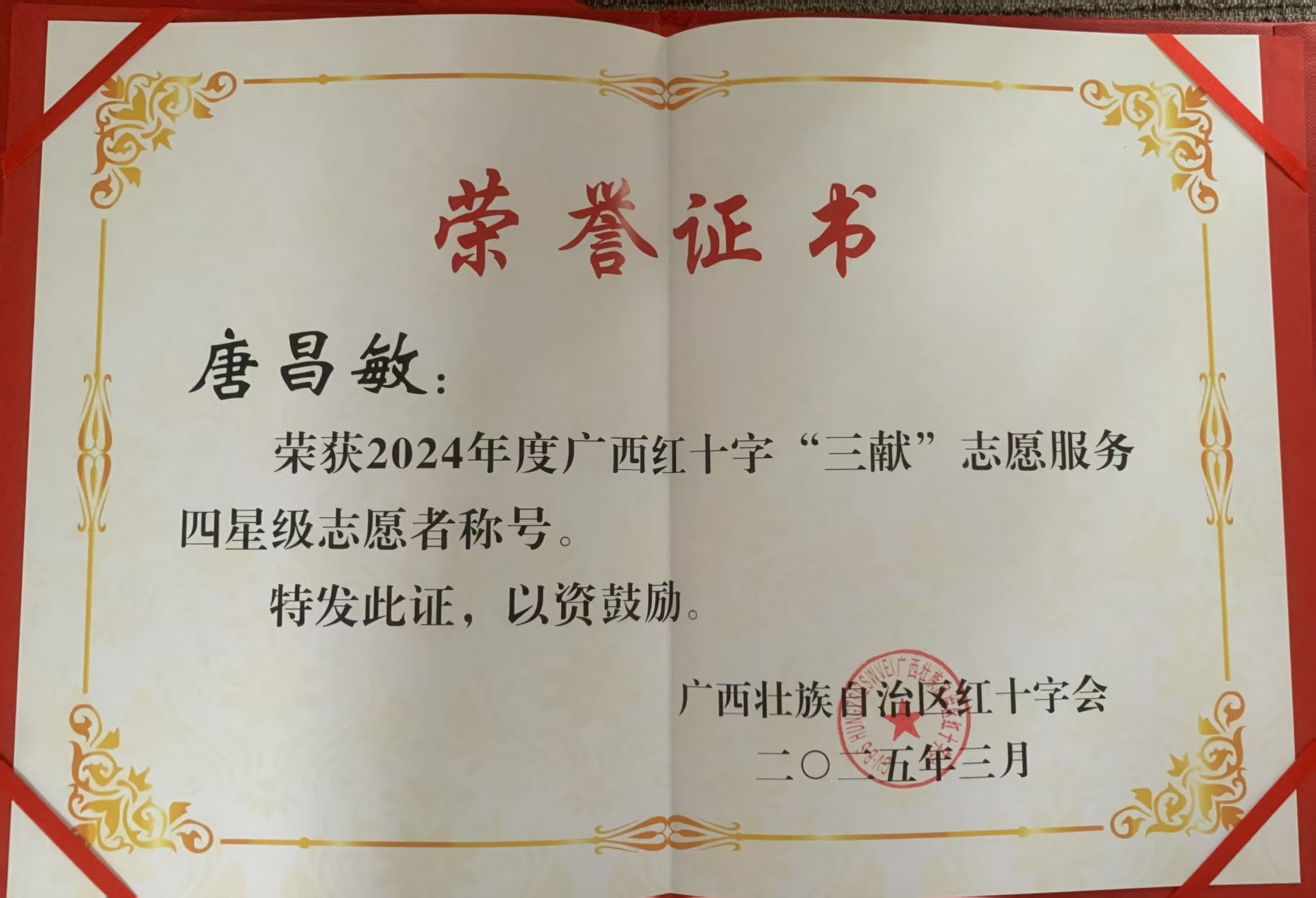 唐昌敏,一位步履不停的“热血使者”。他不仅是累计献血69次、献血总量高达2.61万毫升的无偿献血者,更是一位志愿服务时长超过1400小时的无偿献血志愿者,因在无偿献血和志愿服务中的突出表现,多次获得相关荣誉。唐昌敏拟推荐为2022-2023年度“全国无偿献血奉献奖金奖”以及“全国无偿献血志愿服务奖一星奖”,并荣获2023年度广西红十字会“三献”志愿服务一星级志愿者、2024年度广红十字会“三献"志愿服务四星级志愿者等奖项。同时,在工作单位,他也多次荣获“优秀共产党员”和“优秀党务工作者”称号。这些荣誉不仅是对唐昌敏个人贡献的肯定,也激励着更多人投身公益事业。