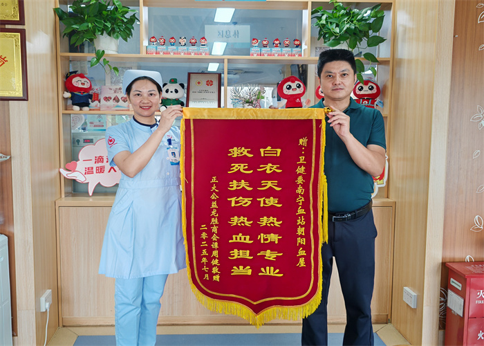 8月1日,南宁龙胜商会、正大公益会会长谭周健,带着一面印着“白衣天使热情专业 救死扶伤热血担当”的锦旗,专程送到朝阳捐血屋机采室。这面锦旗,是他对医护人员在血小板采集过程中始终如一的暖心陪伴最真挚的感谢。“朝阳机采血小板的团队不仅技术过硬,更让我感受到家人般的关怀。”谭周健的话语里满是动容。