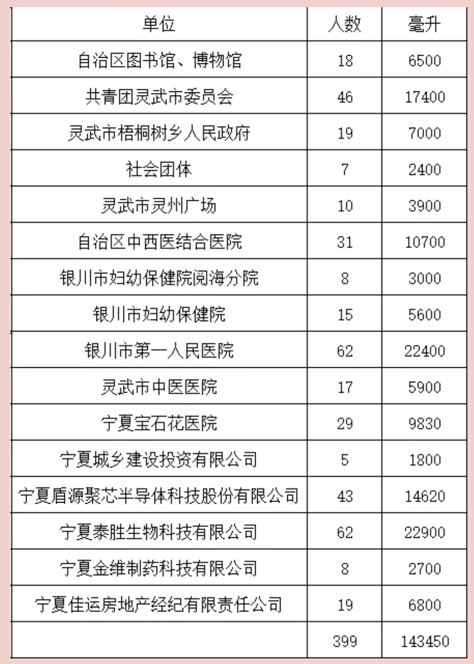 据统计,在七月的主题献血活动期间,宁夏血液中心共组织开展了16场团体无偿献血活动,成功凝聚了399位爱心人士的力量,采集血液总量达143450毫升,为亟待用血的患者送去了生命的希望。在此,宁夏血液中心向每一位献血英雄致以最崇高的敬意!