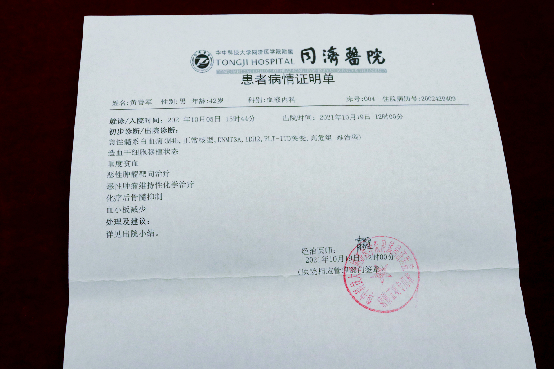 2020年,黄善军不幸被确诊白血病,生活重心瞬间从工作转向与病魔的抗争,辗转奔波于佛山、广州、武汉的医院。漫长的治疗中,他需要大量的血液输注,其中包括珍贵的血小板。