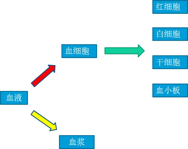 输血中所用血液制品全是从血液中提取分离出来的,所以要讲血液制品就要先从血液成分讲起,血液主要分为血细胞成分和血浆,血细胞成分包含红细胞、白细胞、血小板以及干细胞。
