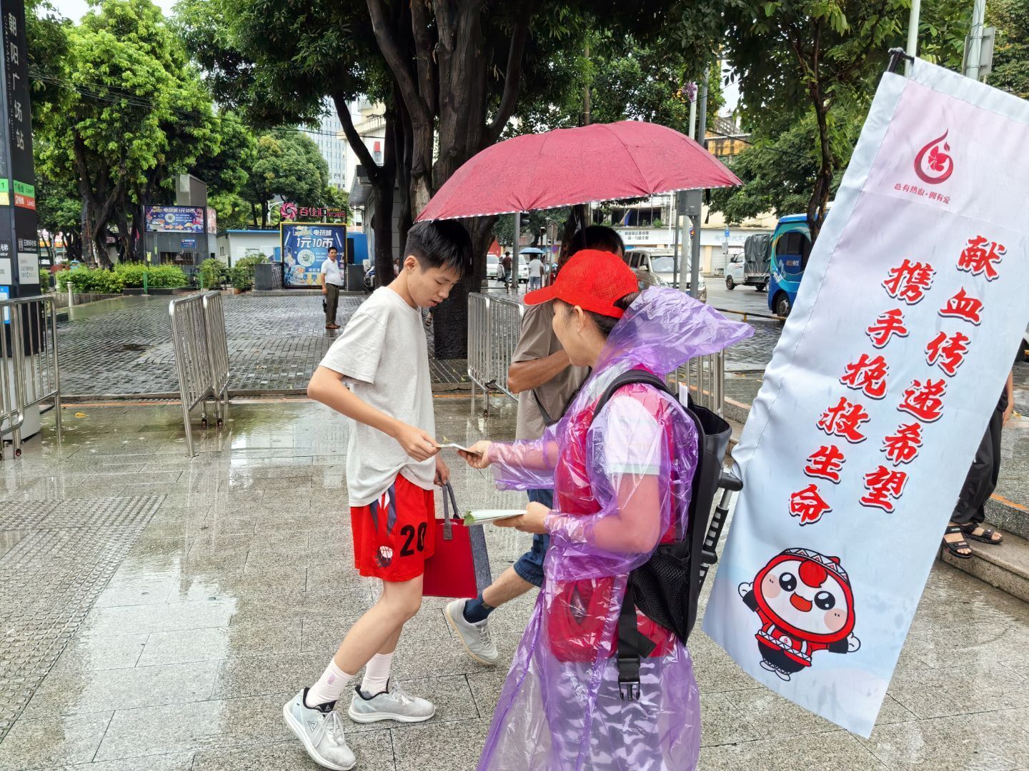 由28名志愿者组成的“红色小分队”,足迹遍布南宁市区周边乡镇、横州市及各区县,每日重复上百次“您好,欢迎了解无偿献血知识……”的宣传话语。他们顶着日均35℃高温,在全市血屋、流动献血点、商业楼宇、村委大院及集市摊位前搭建流动宣传站,以小推车、宣传背包为载体,手持无偿献血资料、环保袋、扇子等物资织就密集宣传网络。即便遭遇暴雨天气,仍撑伞披雨衣坚守街头开展无偿献血宣传,用实际行动诠释对公益事业的执着担当。