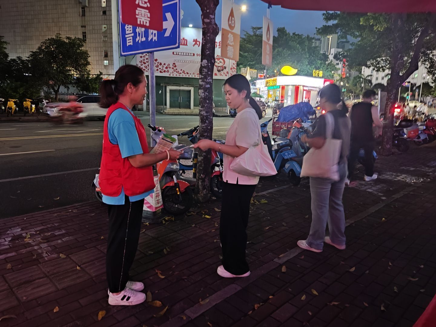 志愿者夜晚在街头宣传