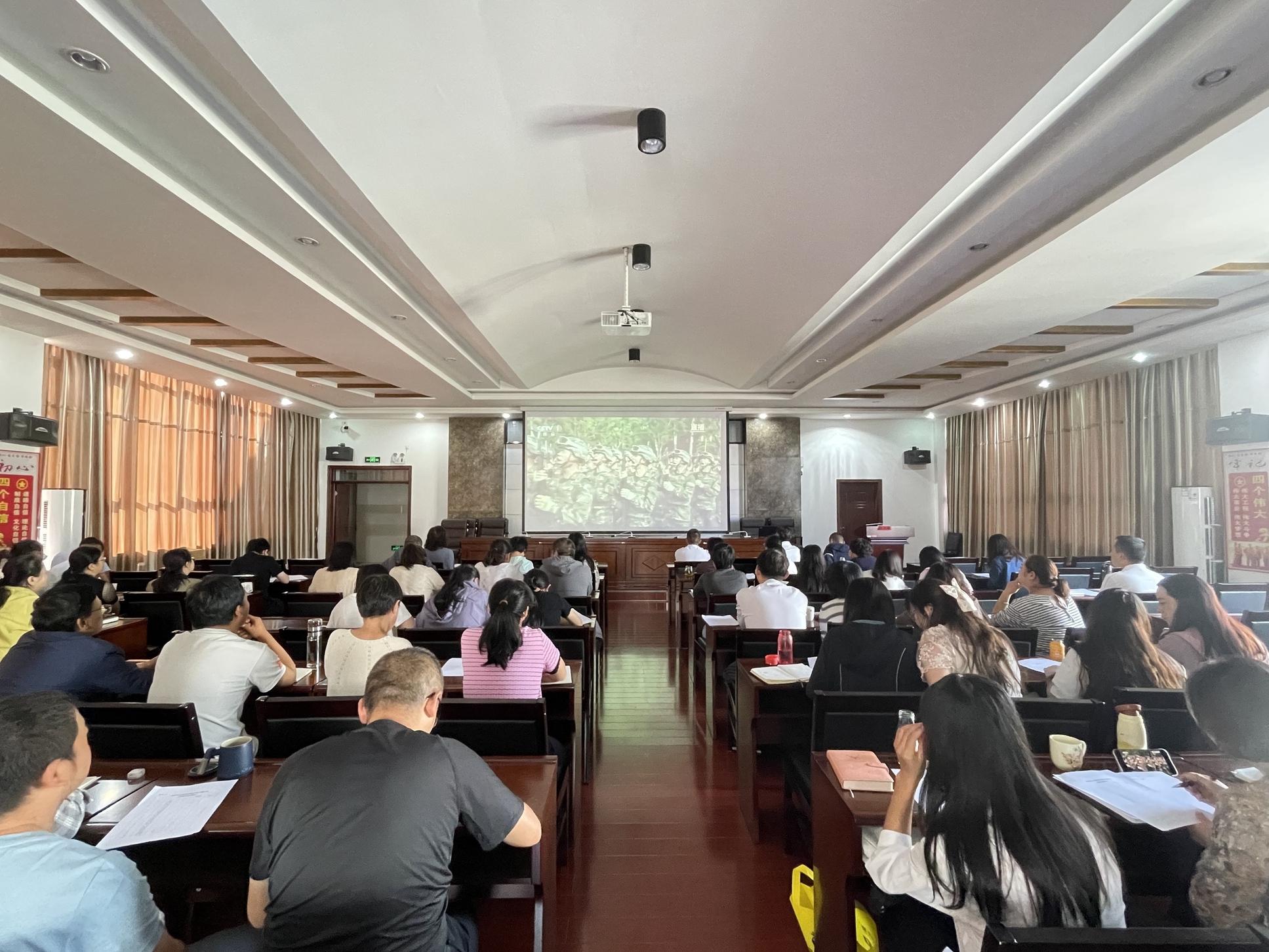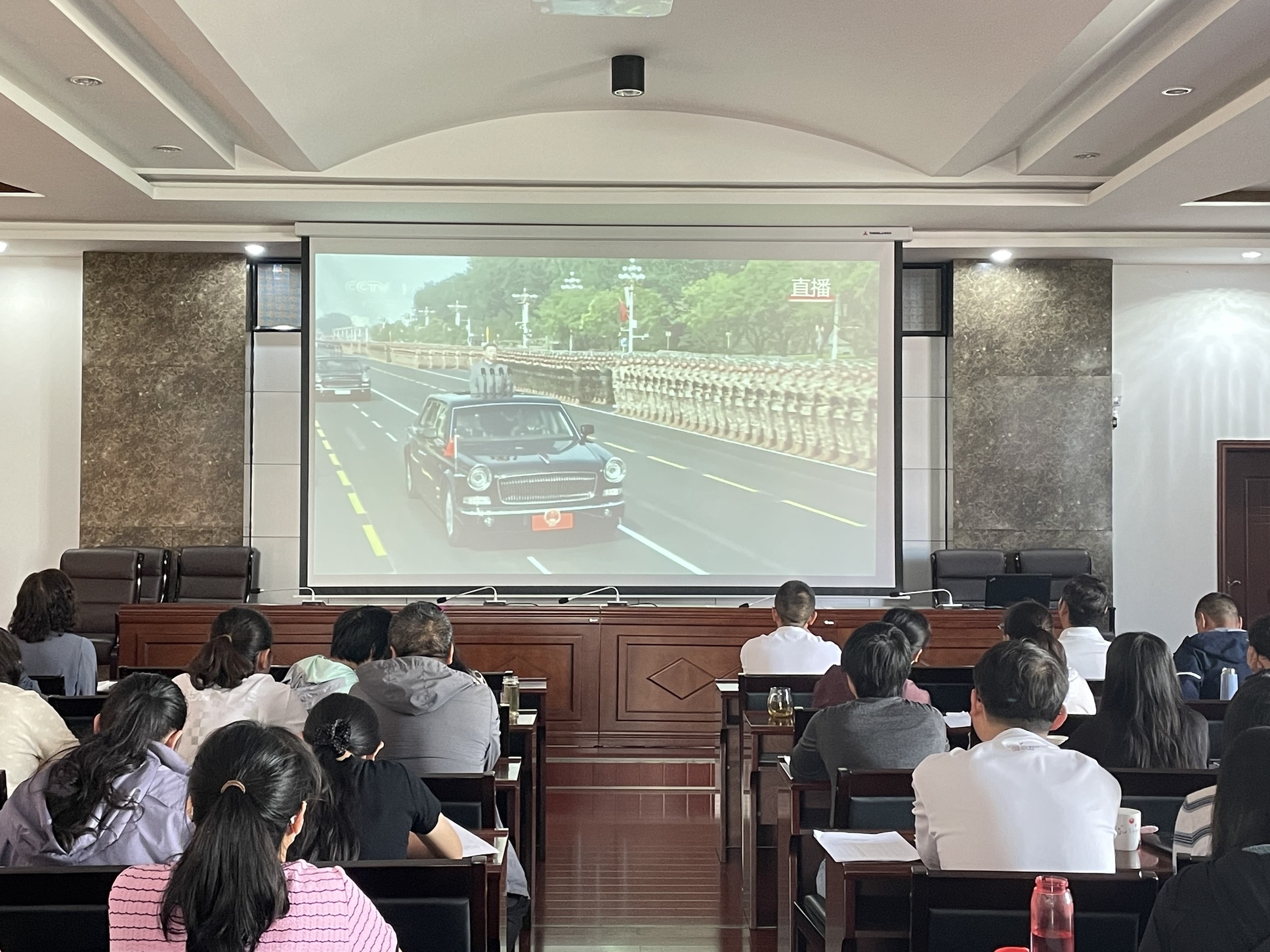 州中心血站全体干部职工在站内会议室整齐就座,通过央视直播同步收看在北京天安门广场举行的阅兵庆典。仪式上,80响礼炮、国旗护卫队、联合军乐团与千人合唱团同频共振,受阅徒步方队、装备方队与空中梯队依次通过,充分展示了新时代人民军队的强大实力与维护和平的坚定决心。