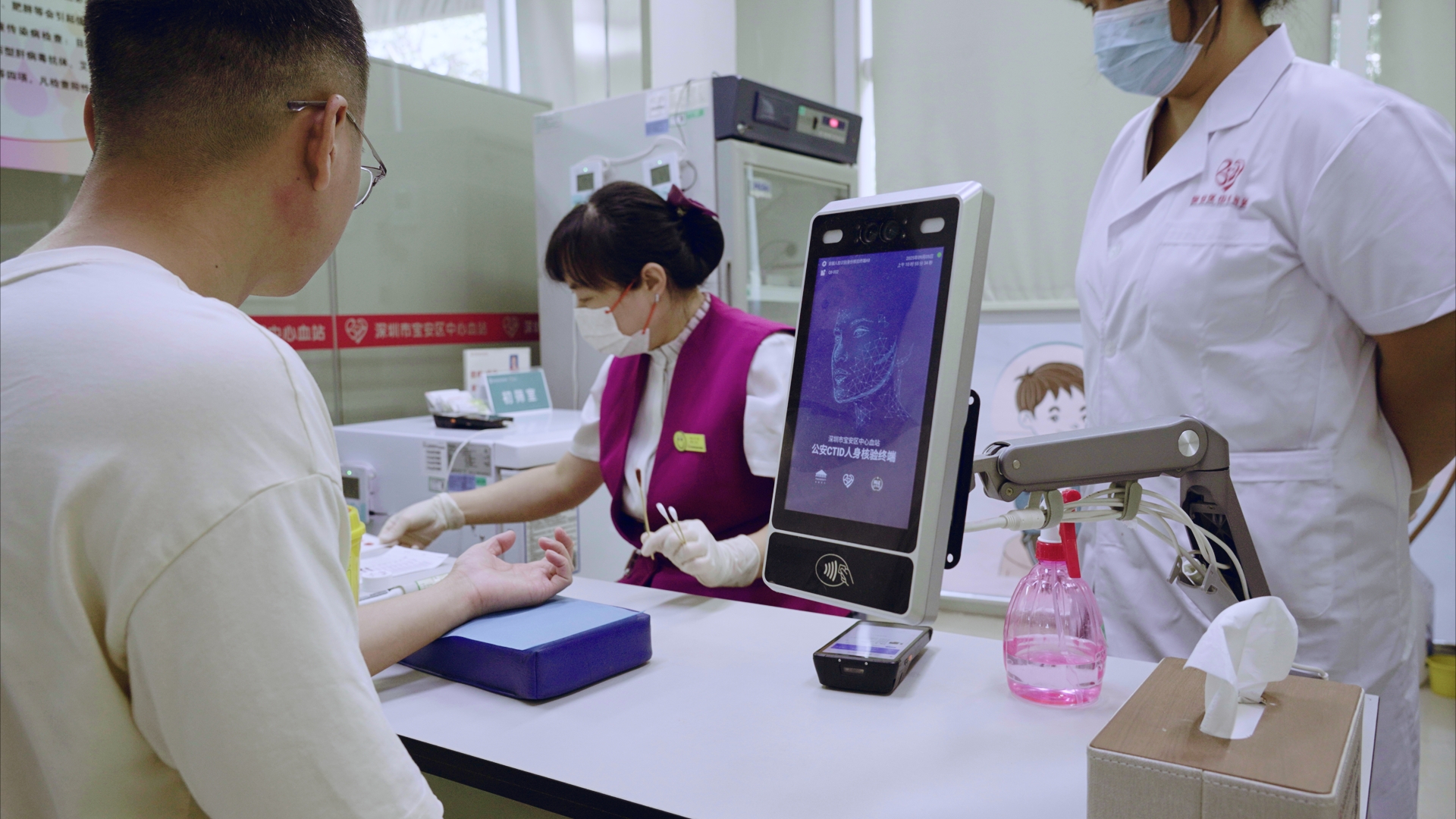 10:10,体检护士使用智慧采血平板扫码及人脸识别设备,确认献血者身份信息;初筛护士和采血护士仅需手持PDA再次扫码,献血者身份、初筛结果、采血量等数据同步上传深圳市血液管理平台,全程无纸、无需重复勾选、签名。无纸化流程再提速,献血体验“零等待”