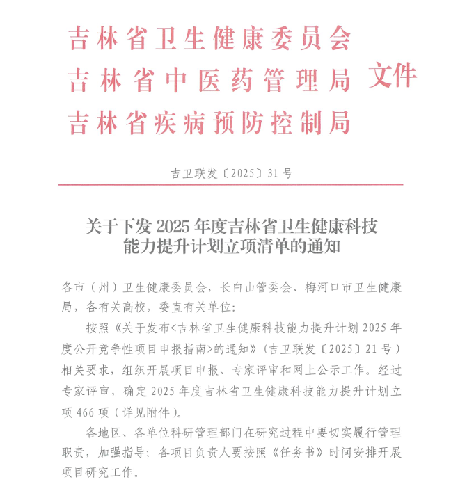 近日,由吉林省卫生健康委员会、吉林省中医药管理局、吉林省疾病预防控制局联合印发的《关于下发2025年度吉林省卫生健康科技能力提升计划立项清单的通知》中,长春市中心血站的4项课题通过专家评审成功立项,其中包括科研能力培育项目A类1项、科研能力培育项目B类3项。