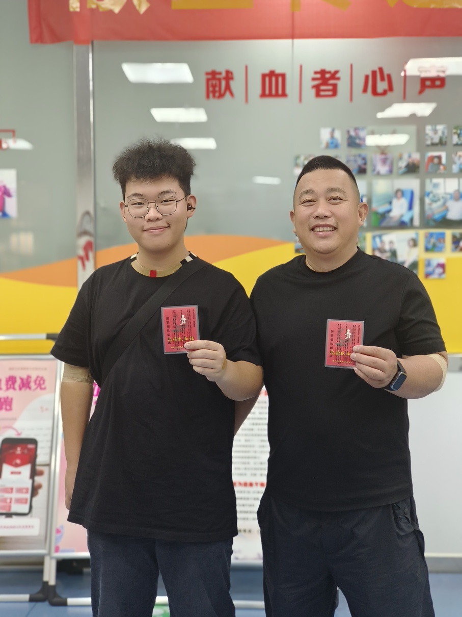 秋日暖阳下,父子手持鲜红的无偿献血证,相视而笑。那抹红,是爱心的见证,更是赤子之心的跃动。天安门广场的阅兵震撼并未止于感动,而是化作了挽袖献血的具体行动。父子同行,让这份家国情怀有了代代传承的厚重内涵。这是从阅兵场延伸到献血屋的温暖与担当,如九月的阳光,照亮生命之路,也照亮新时代青年的奉献之路。