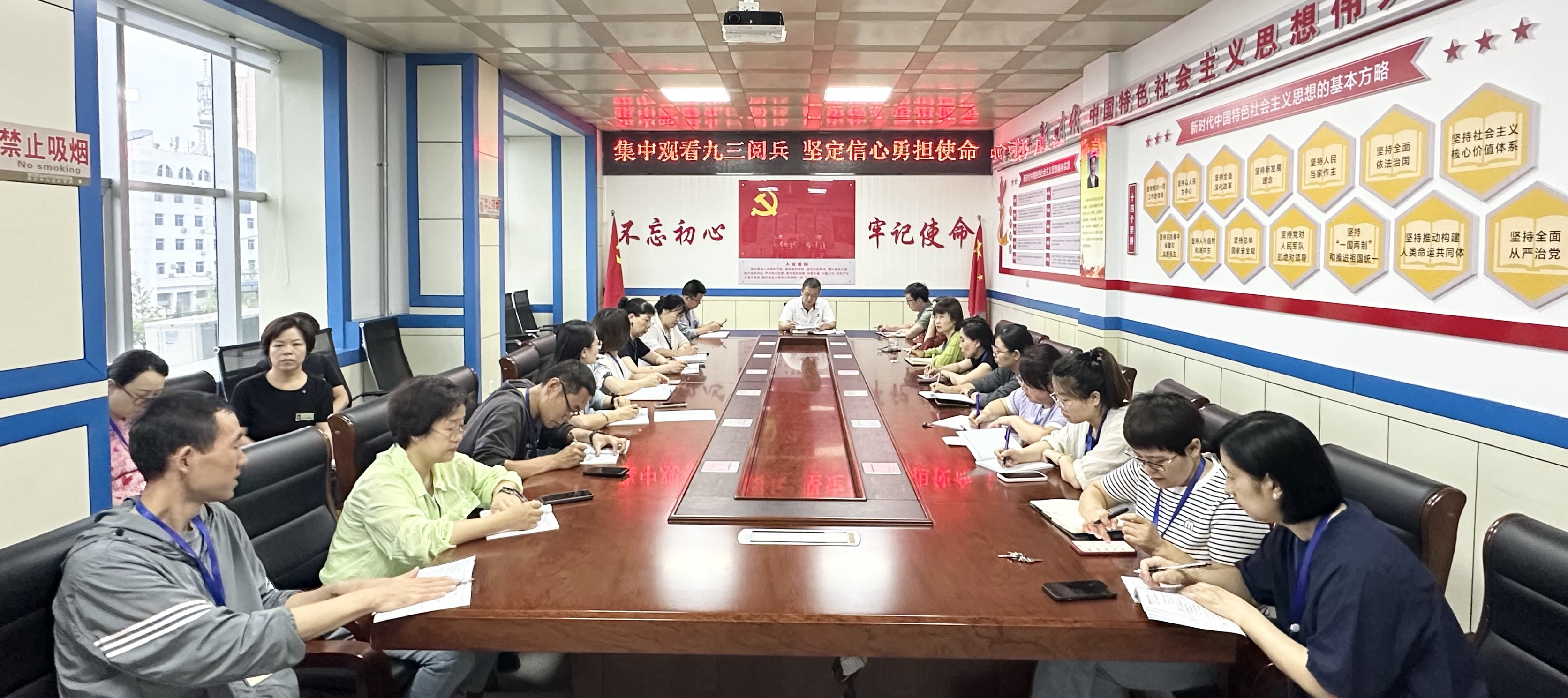 8:30分,党员、职工早早聚集在会议室屏幕前,等待观看阅兵直播。当国歌奏响、国旗冉冉升起时,全体起立,跟随直播现场一起唱响国歌。