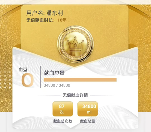 无偿献血十八年,泾阳咸阳传佳话。潘东利已经累计献血87次,献血总量达到34800毫升。科学献血无损健康,帮助他人,健康自己。谈到献血救人的好处,潘东利的快乐之情溢于言表。