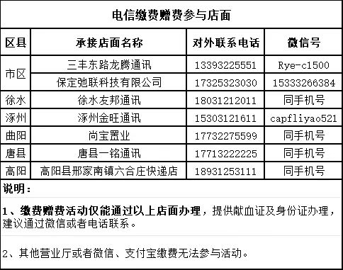 以上缴费活动仅限以下店面参与,可通过添加微信或电话联系线上办理,到其他营业厅或微信、支付宝缴费无法享受优惠哦~