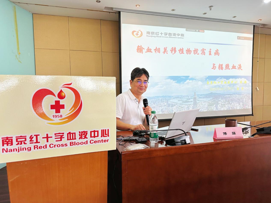 为继续落实南京都市圈血站高质量发展合作协议,切实增强都市圈内采供血机构从业人员综合素质,大力促进优质培训资源共享,中心于8月26日下午两点在七楼报告厅举办2025年第七期南京都市圈血站培训。本次培训邀请中心副主任傅强授课,授课主题为“输血相关移植物抗宿主病与辐照血液”。本次培训继续采取线下和线上同步培训模式,即南京红十字血液中心全体员工现场参加培训,同时邀请南京都市圈内外其他血液中心、中心血站及分站通过腾讯会议在线观看聆听。