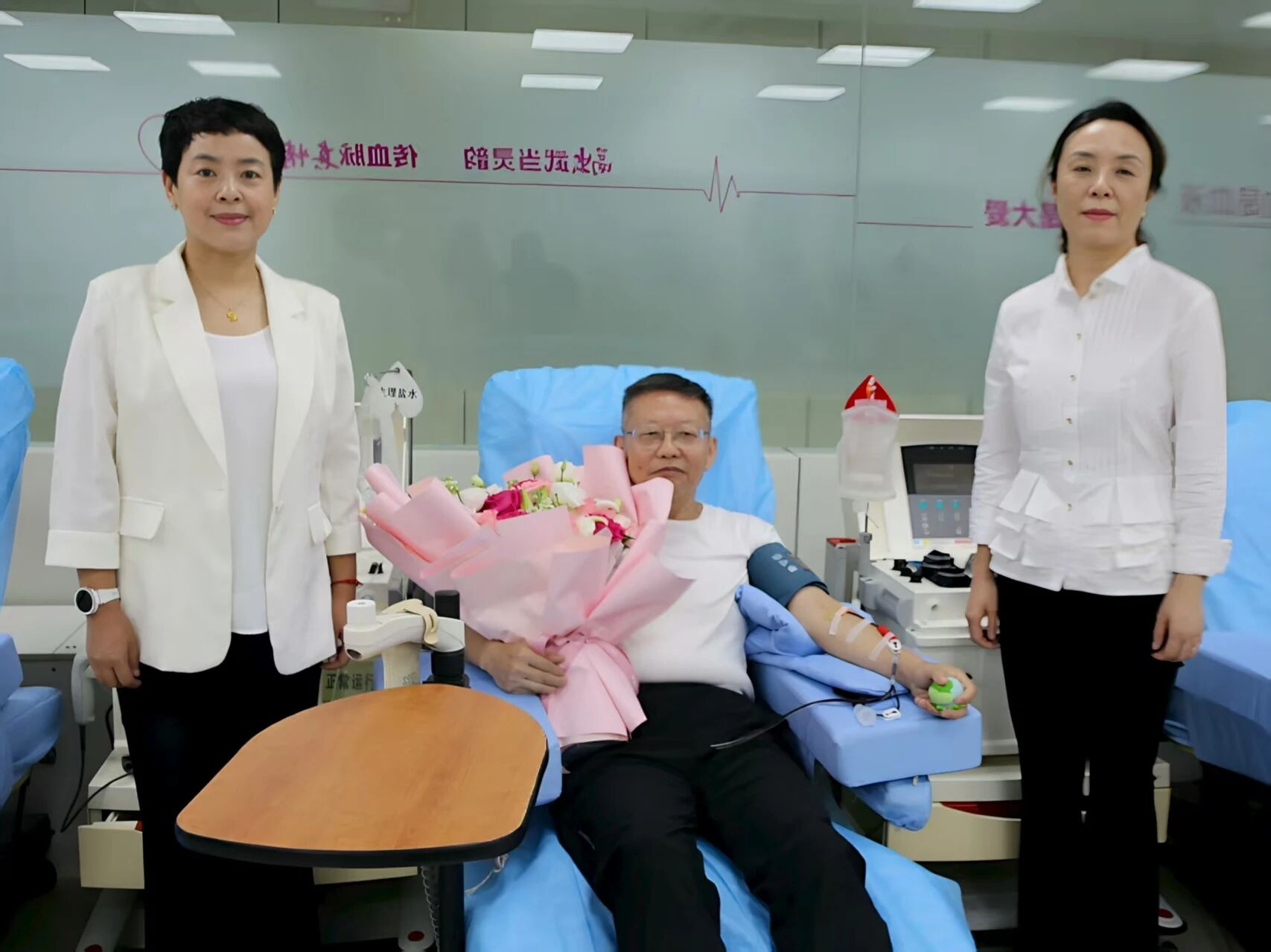 得知今天是刘德旭最后一次献血,市中心血站负责人来到现场,为他送上祝福,并向刘德旭25年来支持无偿献血事业的善举表示感谢。