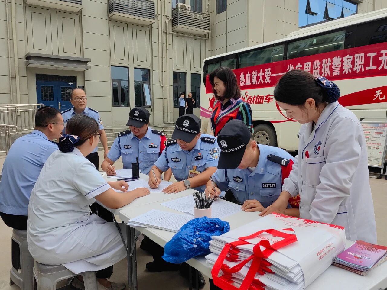 活动现场,工作人员提前做好物资准备与场地布置,详细讲解献血流程、注意事项及健康知识,为参与人员提供贴心服务。监狱警察职工积极响应,在完成信息登记、健康检查等环节后,有序登上献血车捐献血液。