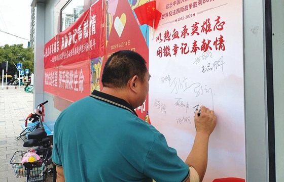 签名铭志,徽章传情在小商品城西、高密、寿光、安丘四个献血屋,设置了抗战胜利80周年纪念签名活动。签名墙上,笔锋流转处尽是深情。欢迎前来留下您的姓名,许下承诺,传递信念。