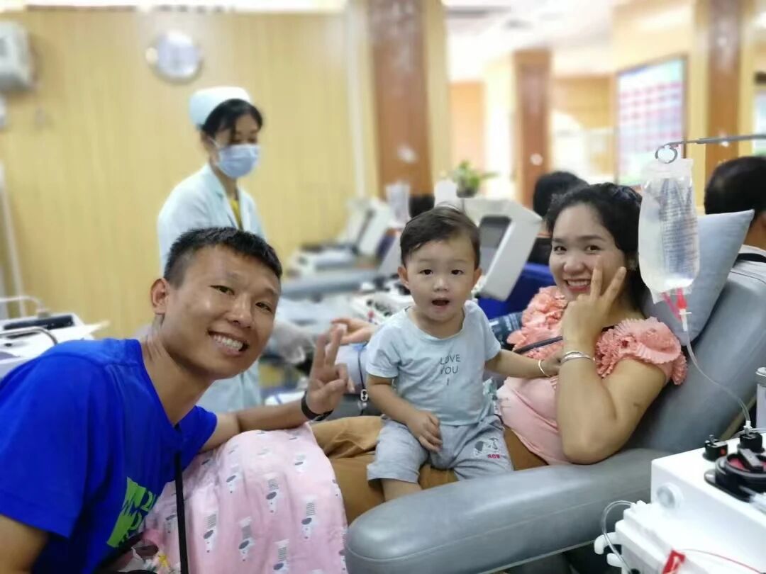 郭嘉力和孩子陪伴妻子献血